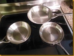 :3 pans on stovetop.